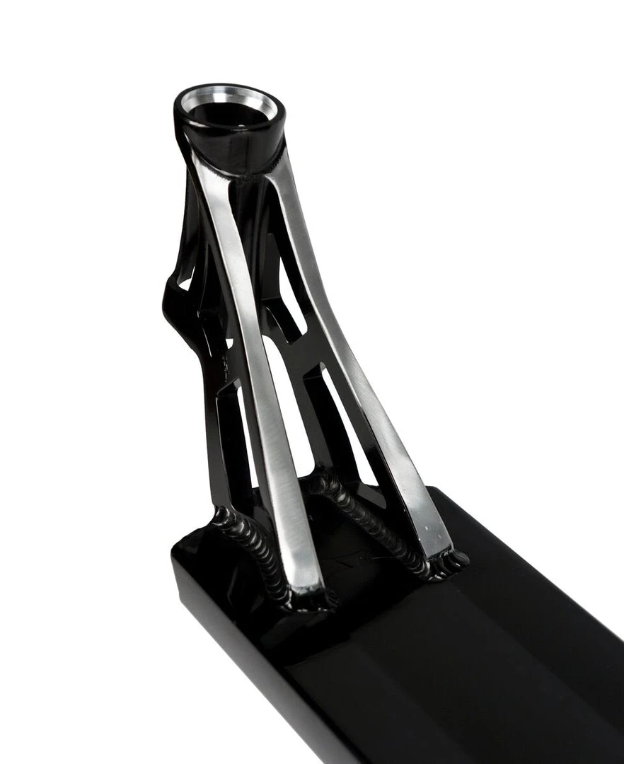The S2 is 5.35” wide which provides for more control over your deck and a more comfortable ride. Near indestructible aluminum drop outs allow for more precise 5-0 grinds and hold the back axle snuggly in place. The deck is 3mm thinner which is a major improvement in the way you feel your deck. The thoroughly reinforced headtube comes with a 84 degree headtube angle which lets you lock and sit inside of noseblunts and crooks/overcrooks. Despite is large size of 23” the deck is surprisingly light but exceptionally strong and has been tested by some of our heaviest hitting riders for over 6 months without damage or even bending. It’s also very evenly weighted and you feel like you’re sitting right in the middle of the deck.