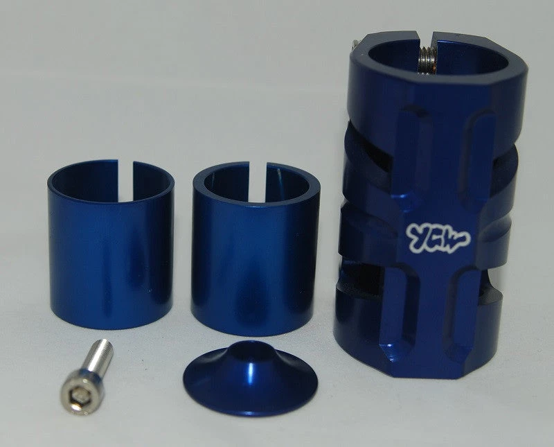 The YGW Innovations “Mission” JAC clamp is CNC machined from a solid block of billet 6061-T6 Aluminum. The JAC type Mission clamp was engineered to make the assembly of your scooter a breeze! No more struggle getting your fork, dust cover, clamp, and bars all aligned! The JAC system has same strength as a traditional SCS style system with added simplicity.