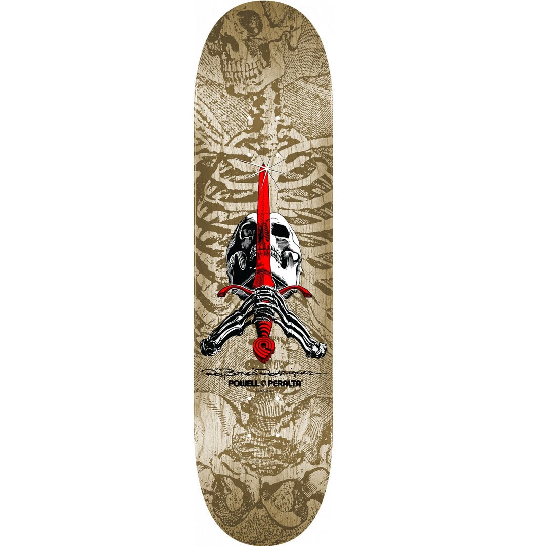 The Rodriguez “Skull & Sword” deck was the first pro signature deck graphic produced by Powell-Peralta. The graphic was conceived by Ray and Illustrated by V.C. Johnson with art direction from George Powell in 1979.