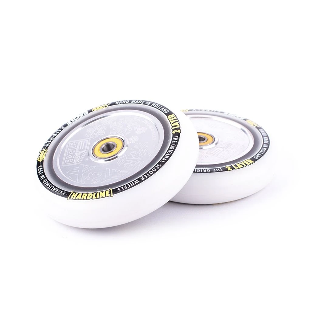 Available with Laser Etched Logo cores. Made from Certified 6061 aluminum extrusion and machined to shape. The Urethane is Hand Poured in Holland according to our own proprietary formulas. The 2-Layer ( Dual Layer) design with this “undersized” HollowTech core, is one of our UNIQUE designs and inventions. The advantage of the Dual Layer is the wheels will get More rebound, More grip and More smoothness when riding. Back are some of our original model names: Snowballs (Silver or Black with White urethane), Panthers (Silver or Black with Black urethane), Sewercaps (Silver or Black with Grey urethane). Each Model comes with it’s own urethane Hardness. SNOWBALLS: just above the “standard” hardness; PANTHERS: just above the Snowballs Hardness; SEWERCAPS: The hardest scooter wheels out there! Our unique 2-layer(Dual Layer) system is often copied but never equaled!