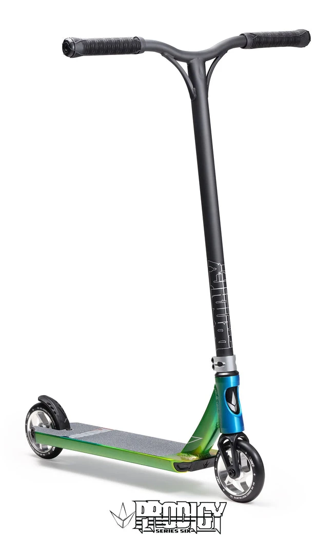 Brand new Prodigy Forks made from the best 6061 grade Aluminum with a high quality color finish. 120mm 6063 Aluminium Extruded core with the best 86a grade Polyurethane with performance bonding to reduce the risk of de-hubbing. The deck is the favorite Prodigy 6061-T6 Extruded Aluminum deck either wrapped or painted in high quality finishes, CNC 82.5 degrees Headtube finished off with Nylon front Plate and rear inserts. This is the perfect scooter for the intermediate to advanced rider ready to progress their rider to the next level.