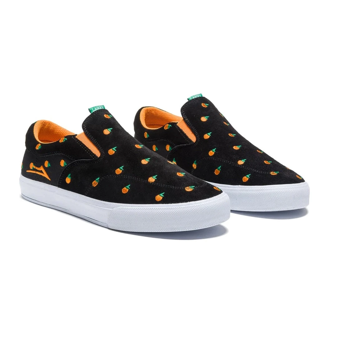 The Larry June Owen VLK is a mix of black suede with canvas underlays. Details include allover embroidered mini oranges with orange and green color highlights and custom art on the insole. Each pair of shoes come with Larry June co-branded box and our version of the classic orange shoe bag.
