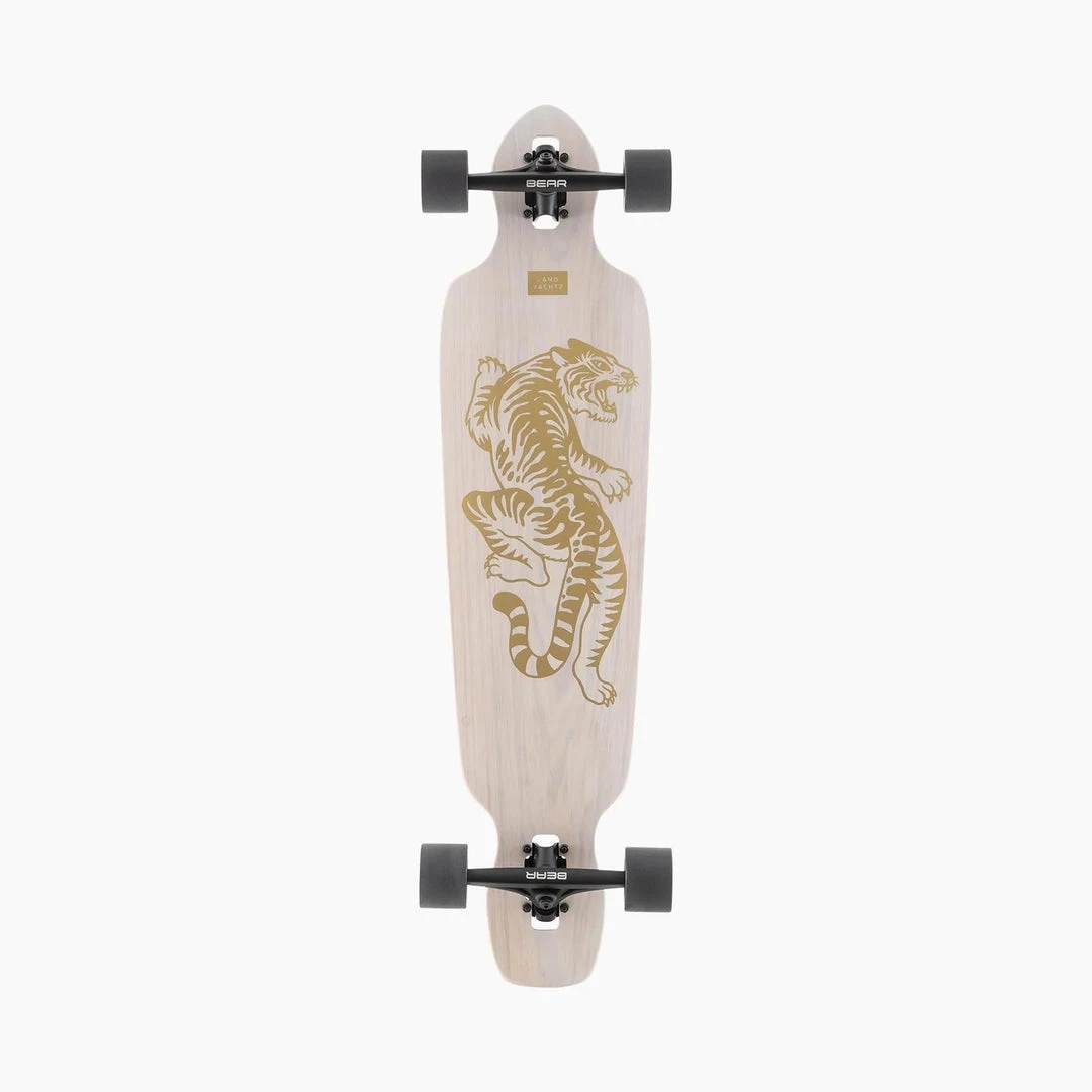 The Battle Axe Bengal is a drop through longboard that measures 38″ long by 9.4″ wide at the front with a significant taper towards the rear. Its 8 ply maple construction gives it a moderate amount of flex which, combined with its super low ride height and mellow concave, makes it a very stable platform ideal for beginners or riders looking for a fast, comfortable board to commute on. The Battle Axe comes equipped with our flagship 50 degree 180mm grizzly Gen 6 trucks ideal for deep carves and confident cruising. The wheels are 69mm 78a Hawgs that will keep you rolling fast, gripping hard and cruising over everything in your path.