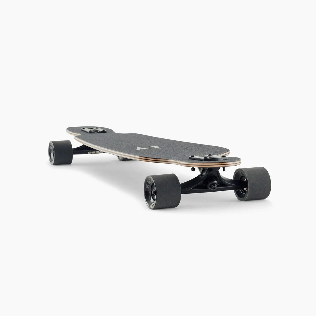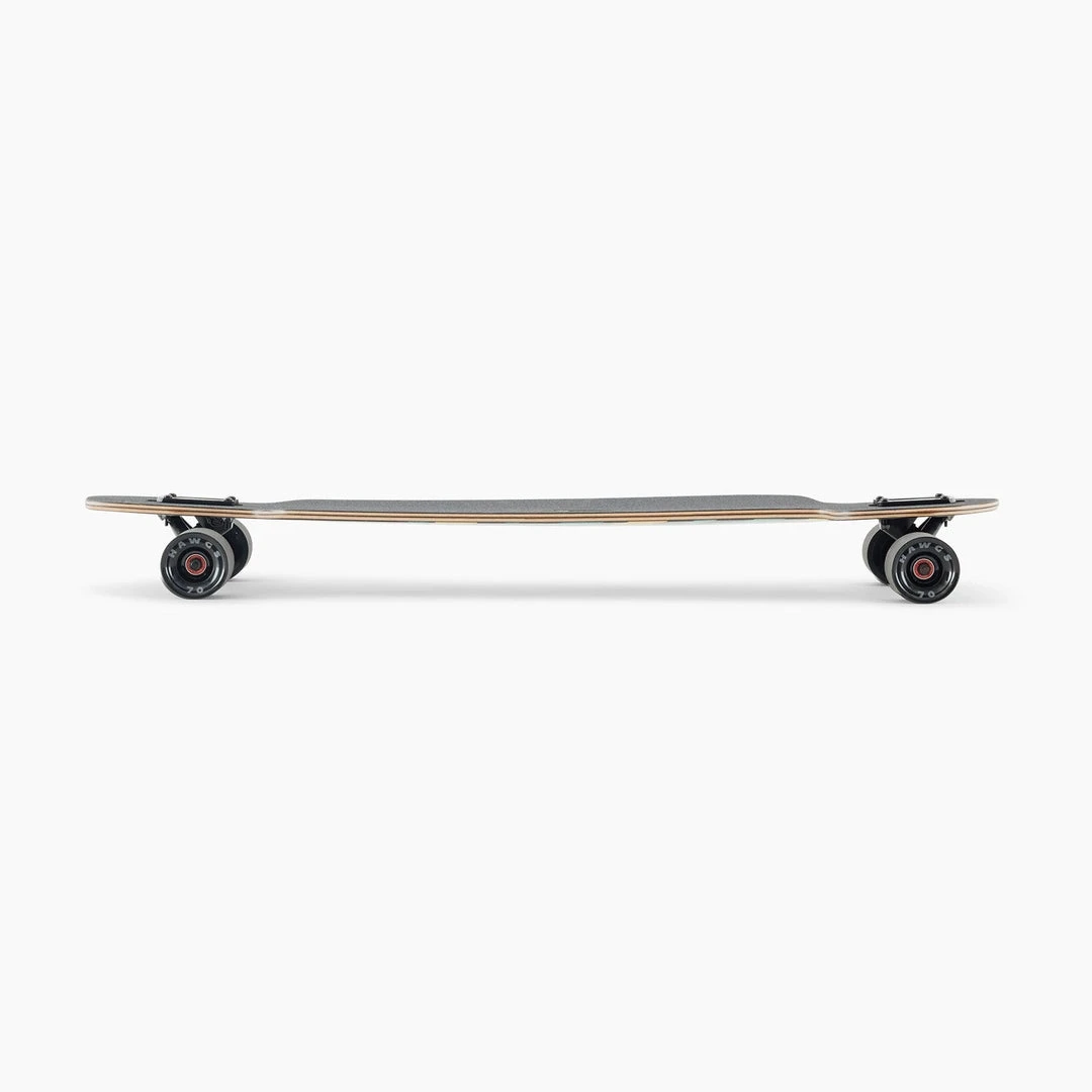 The Battle Axe is a drop through longboard that measures 38″ long by 9.4″ wide at the front with a significant taper towards the rear. The taper is one of the most prominent features, it encourages a front-loaded riding position which makes for a fantastic, predictable, and exciting carve. It’s 8 ply maple construction gives it a moderate amount of flex which, combined with its super low ride height and mellow concave, makes it a very stable platform ideal for beginners or riders looking for a fast, comfortable board to commute on. The Battle Axe comes equipped with our flagship Bear Gen 6 50-degree 180mm Grizzly trucks ideal for deep carves and confident cruising. The wheels are 70mm 78a Hawgs Supremes that will keep you rolling fast, gripping hard and cruising over everything in your path. We made sure to shape the tail in such a way that you can use it to kick the board up into your hand or even sneak in a cheeky manual. The Battle Axe will carry you anywhere you need to go with style and ease.
