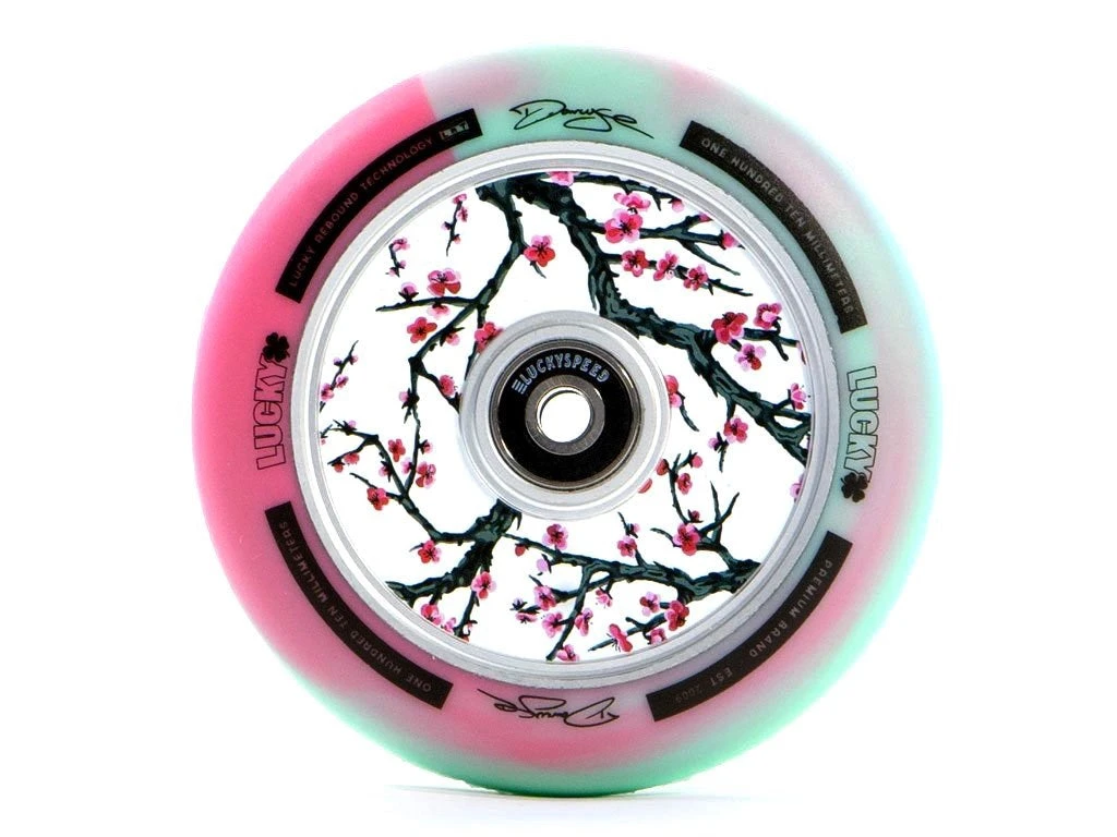 For Darcy’s first Lucky Signature product he wanted to include a Green Tea style graphic that stands out on a white background. Being that Green Tea is his go to beverage when out riding it made total sense. This wheel features a dual colored core with pink accents to match the core graphics. Out of the box this wheel is ready to shred with pre-installed LuckySpeed Bearings.