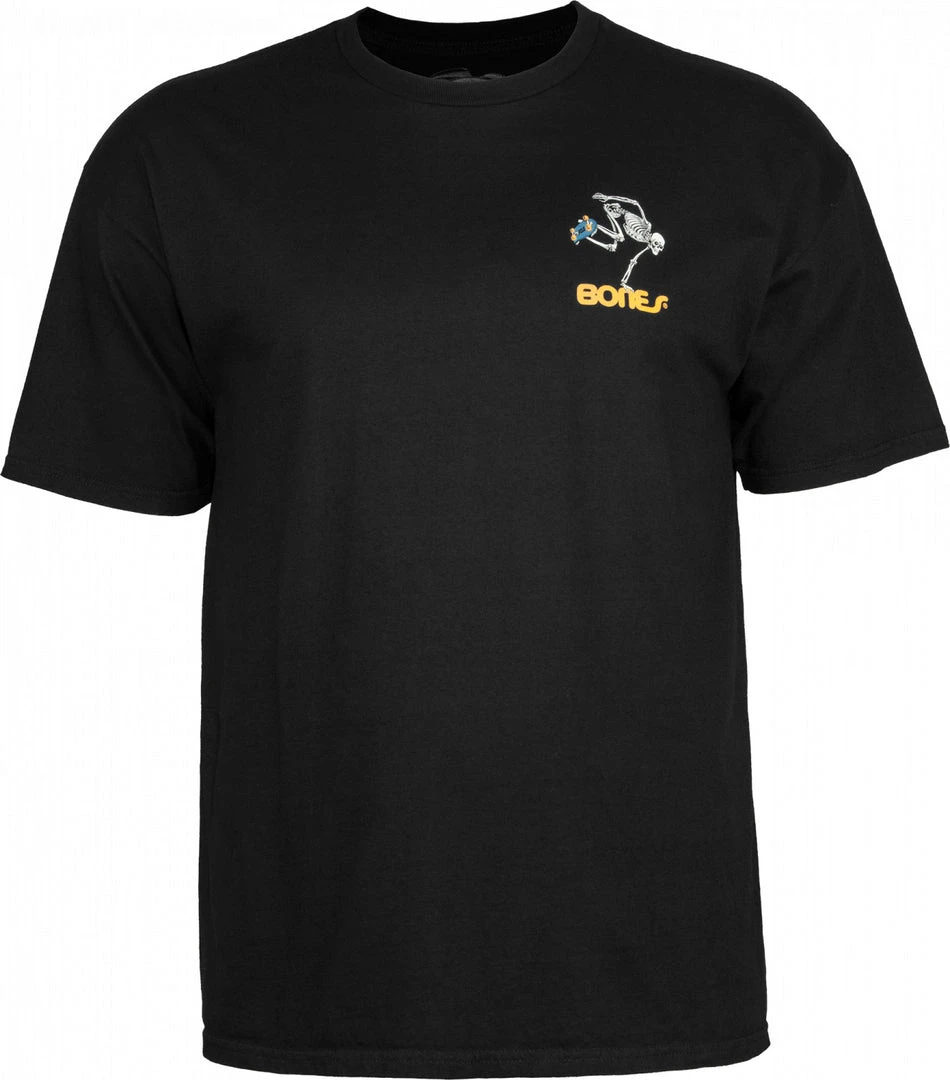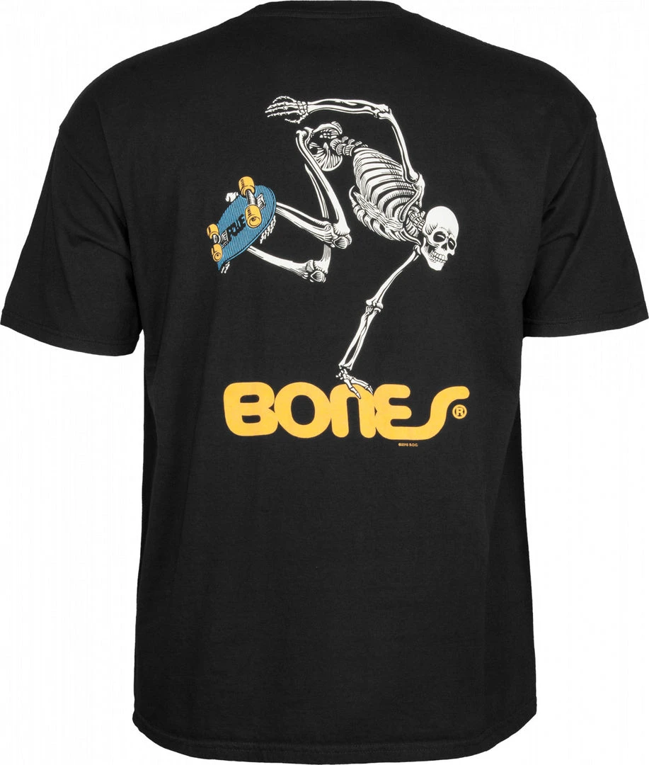 In 1977, artist VCJ illustrated two black-and-white posters to promote Bones wheels. About a year later, Court sat down to work on a new project that would turn that Bones theme into the concept of a skateboarding skeleton. To help Court make the image as realistic as possible, George bought a life-sized skeleton from a medical supply shop. Court named her Rosie. After several hours of propping and rigging, Rosie hung frozen in the position of a skateboarding skeleton. Court got to work. His piece, completed near the end of 1978, served as a Bones sticker and T-shirt graphic, the first illustration created under the new Powell Peralta brand.