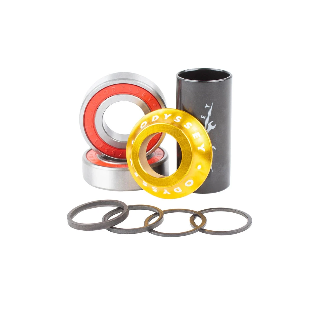 Made to fit all 19mm crank spindles and press-fit Mid BB frames. Simple and easy to install. Includes an assortment of spacers to optimize chain line and crank clearance.