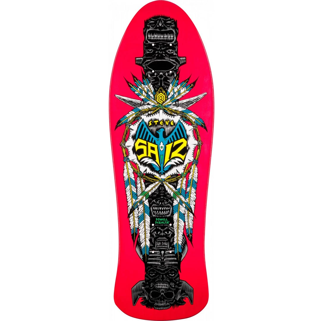 In the late 1980’s, Powell Peralta had an established vert team that was maxed out with the likes of Tony Hawk, Steve Caballero, Mike McGill and Lance Mountain. In an effort to expand the companies pro roster to include the growing “Street-Style” market, they began adding new “street” pros. After Tommy Guerrero it was Mike Vallely, then Ray Barbee. The fourth Powell-Peralta Street pro to receive a deck model was Long Beach local, Steve Saiz. His Native American “totem pole” graphic was the second illustrated by newly acquired artist Sean Cliver in 1989. Saiz continued to skate for Powell-Peralta into the early 1990’s until his knee unfortunately gave out.