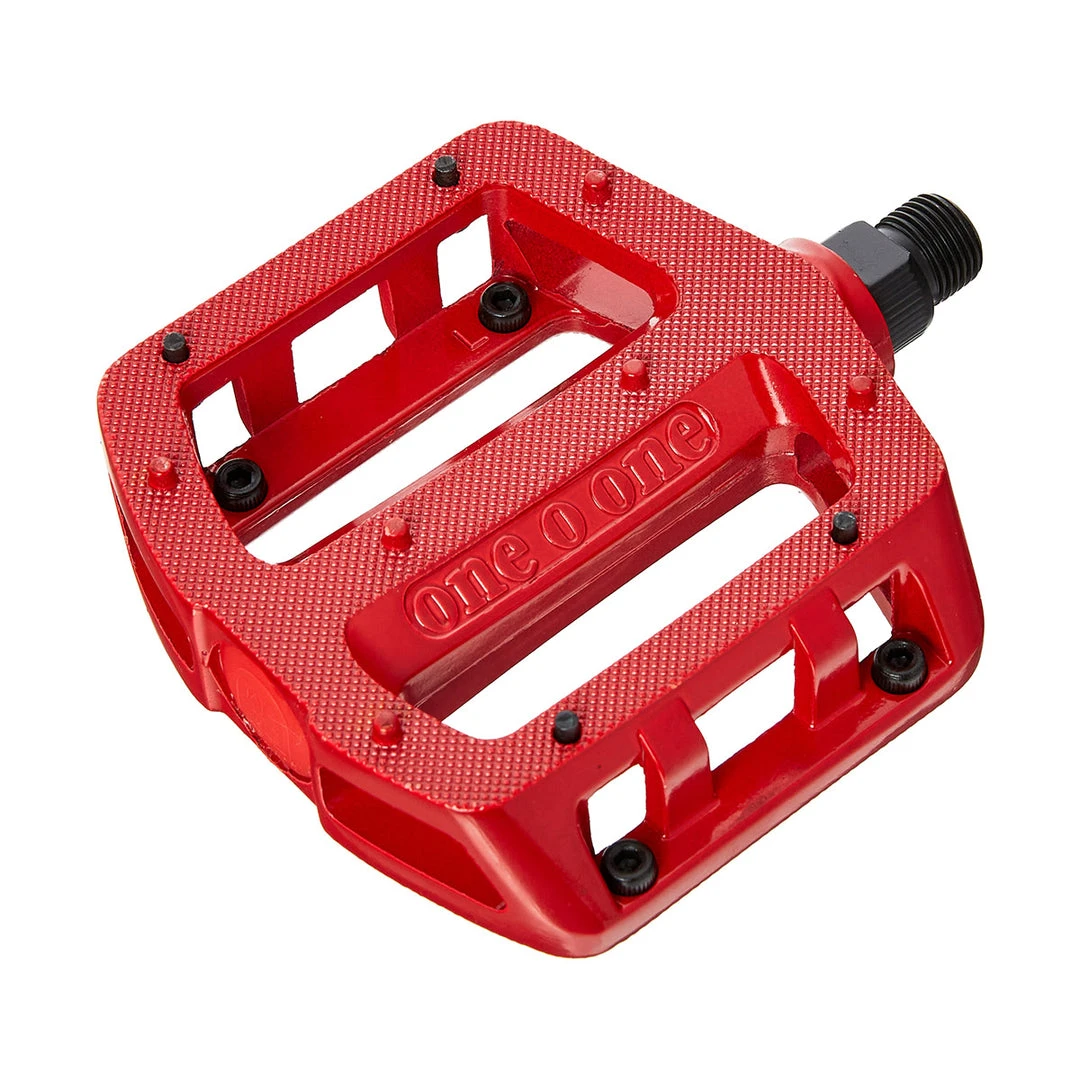 Cast alloy platform with reinforcements to prevent breakage. Combination of molded and replaceable pins for dialing in just the right amount of traction.
