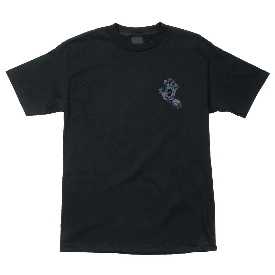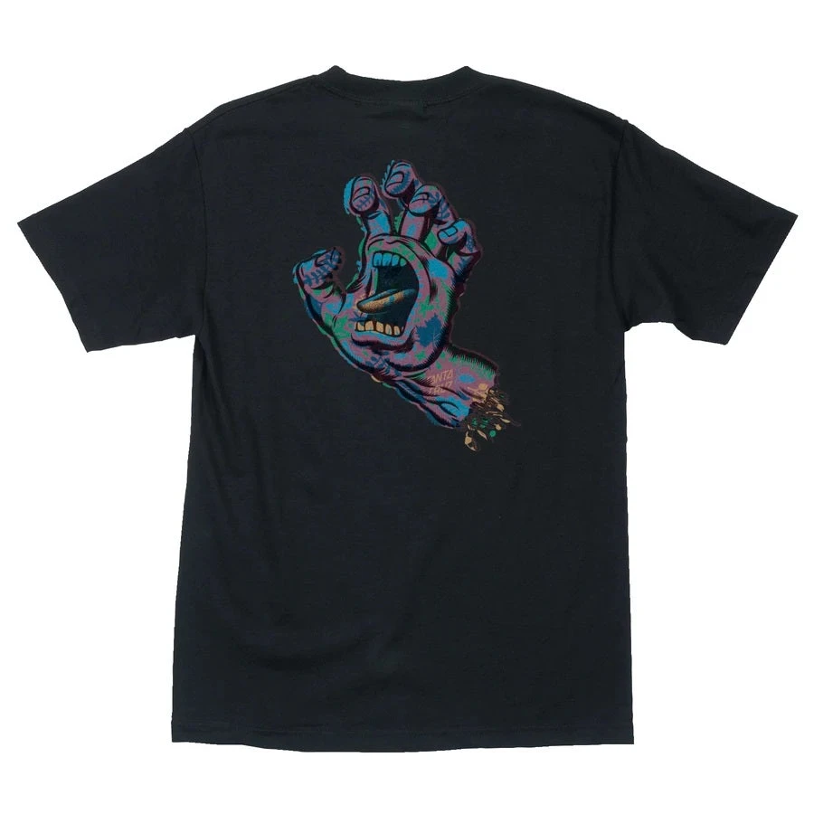 Regular fit short sleeve 5.6 oz. eco-friendly jersey t-shirt made from recycled cotton and polyester fibers, medium front and large back Santa Cruz Growth Hand soft hand ink logo prints.