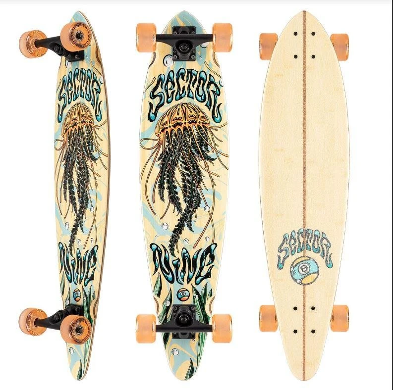 The Jelly Swift Complete Longboard from Sector 9. If you’re looking for a fun and easy-to-ride skateboard that will meet all your carving and commuting needs, this longboarding is a great choice. It comes gripped and ready to ride with soft and fast wheels with a surf board inspired shape.