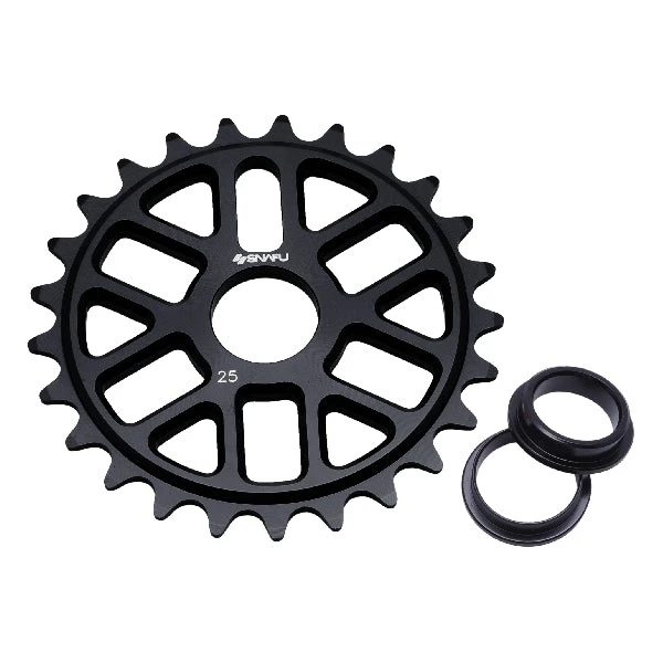 CNC machined from 7075 aluminum with 6 triangular holes and 5 rectangular holes to save weight and a laser etched SNAFU logo for a clean look.