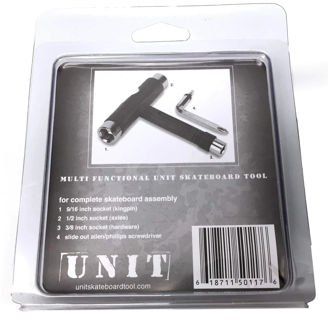 Unit multi-functional skateboard tool that allows you to adjust axle nuts, mounting hardware, and the kingpin nut on the top of the truck.